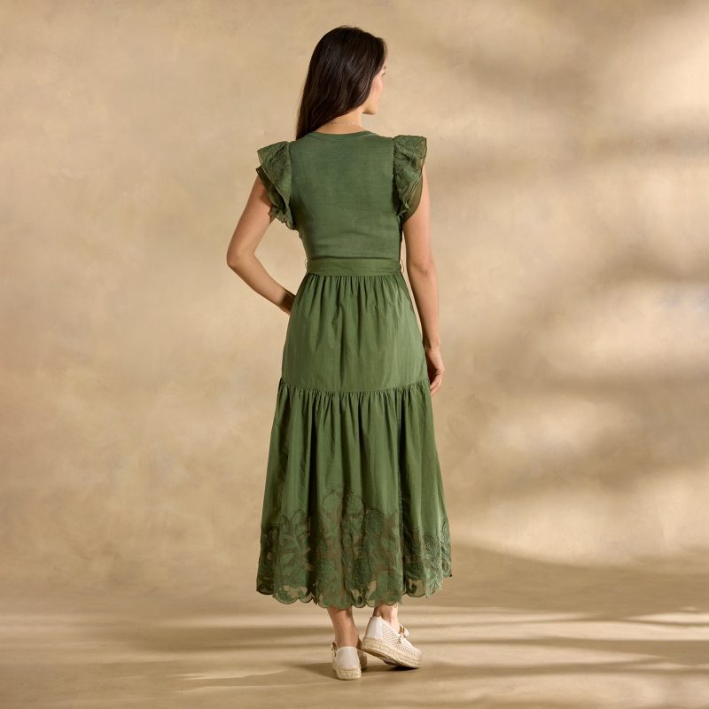A sweeping statement dress with multiple tiers. lush embroidery. button-front. V-neck and short sleeves. Cotton. Dry clean. Imported. Sundance exclusive. Sizes XS (4). S (6). M (8–10). L (12). XL (14). XXL (16). Approx. 50.5l.
