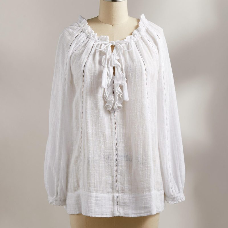 Embrace your artistic spirit in our sheer. easy-fit top with ladder lace. ruffle neckline and tassel ties. Cotton/viscose. Hand wash. Imported. Exclusive. Sizes XXS (00). XS (0 to 2). S (4 to 6). M (8 to 10). L (12 to 14). XL (16 to 18). Approx. 25L.