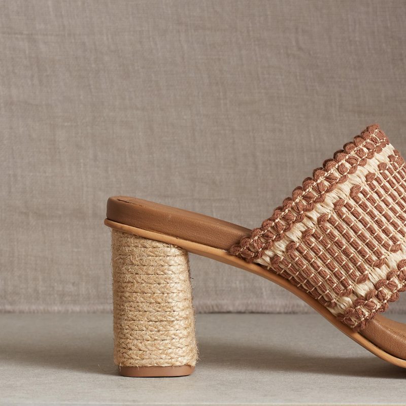Neutrals rule on this slip-on sandal that features delicately woven straps and a block heel. Leather lining. Synthetic. Imported. Sizes 6-11. 2.5 heel.