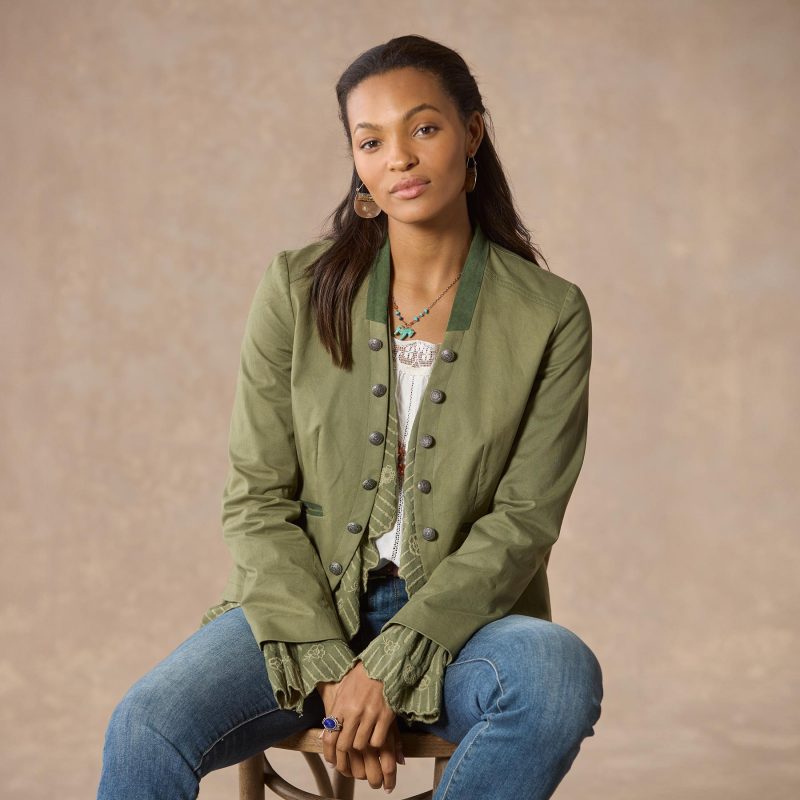 Contrasting velvet trim at the collar and welt pockets lends beauty to our fully lined jacket with ruffle and embroidery detail at the hem and sleeves. Filigree buttons. Cotton/spandex. Machine wash. Imported. Exclusive. Sizes XS (0?C2). S (4?C6). M (8?C10). L (12?C14). XL (16?C18). XXL (20?C22). Approx. 22l.