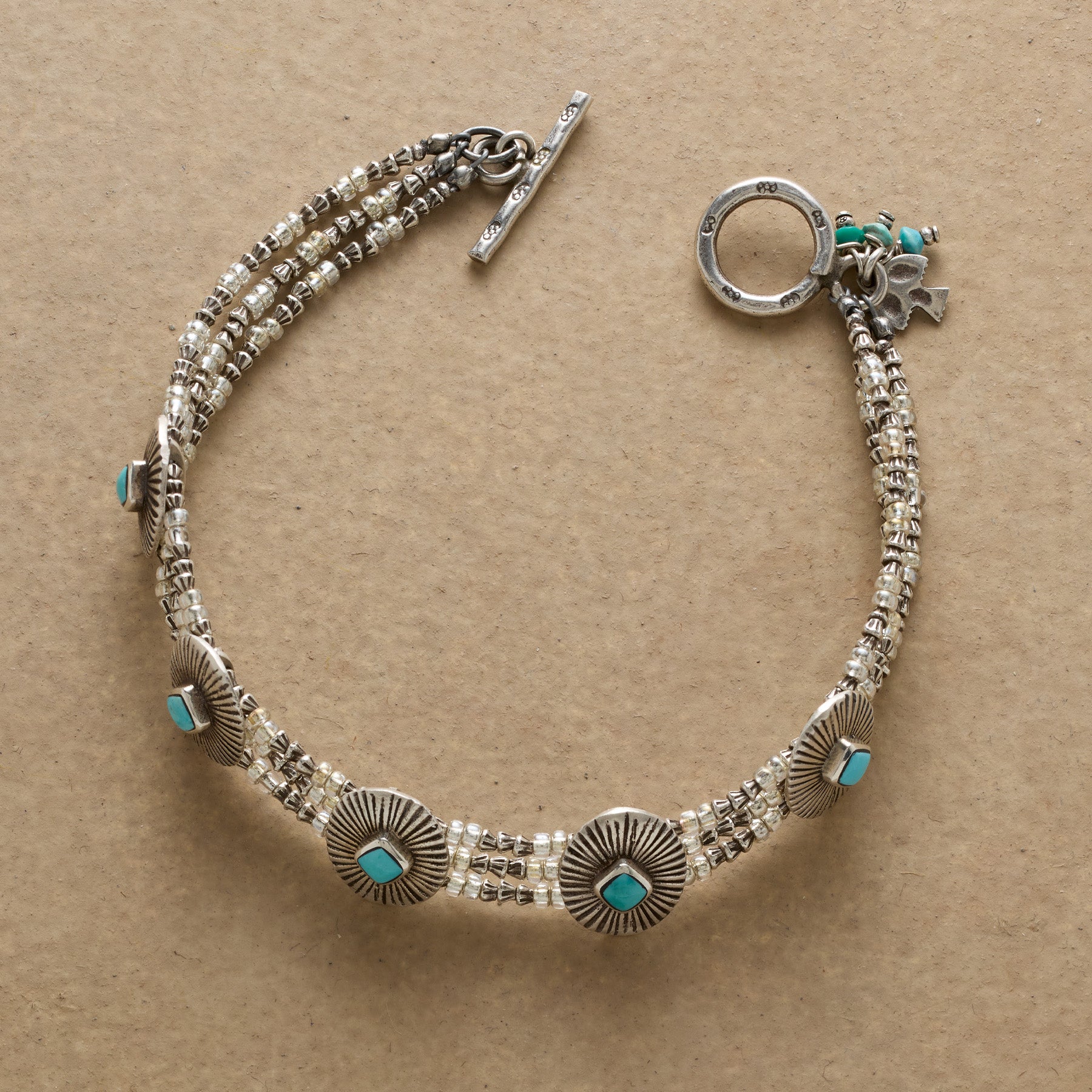 For the free spirit who embraces Southwest style. Our sterling silver bracelet sets five turquoise-studded conchos atop three beaded strands that secure with a toggle clasp. Handcrafted. Exclusive. 7 1/4l.