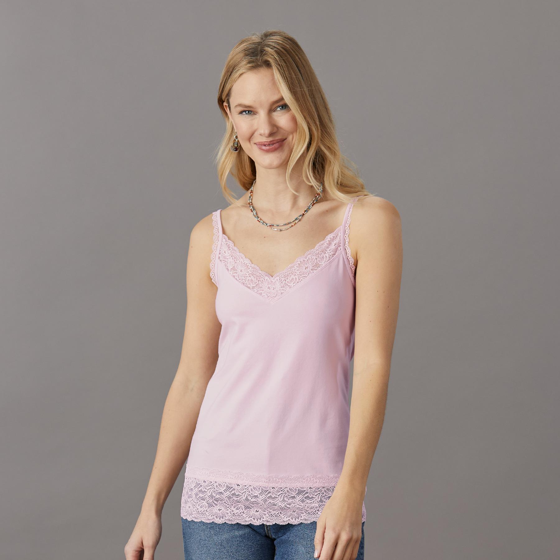 An everyday essential with the most beautiful lace at V-neck. shoulder straps and hem. Stretchy and soft. it makes the perfect underlayer. Supima cotton/spandex. Machine wash. Imported. Exclusive. Sizes XXS (00). XS (0?C2). S (4?C6). M (8?C10). L (12?C14). XL (16?C18). Approx. 24l.
