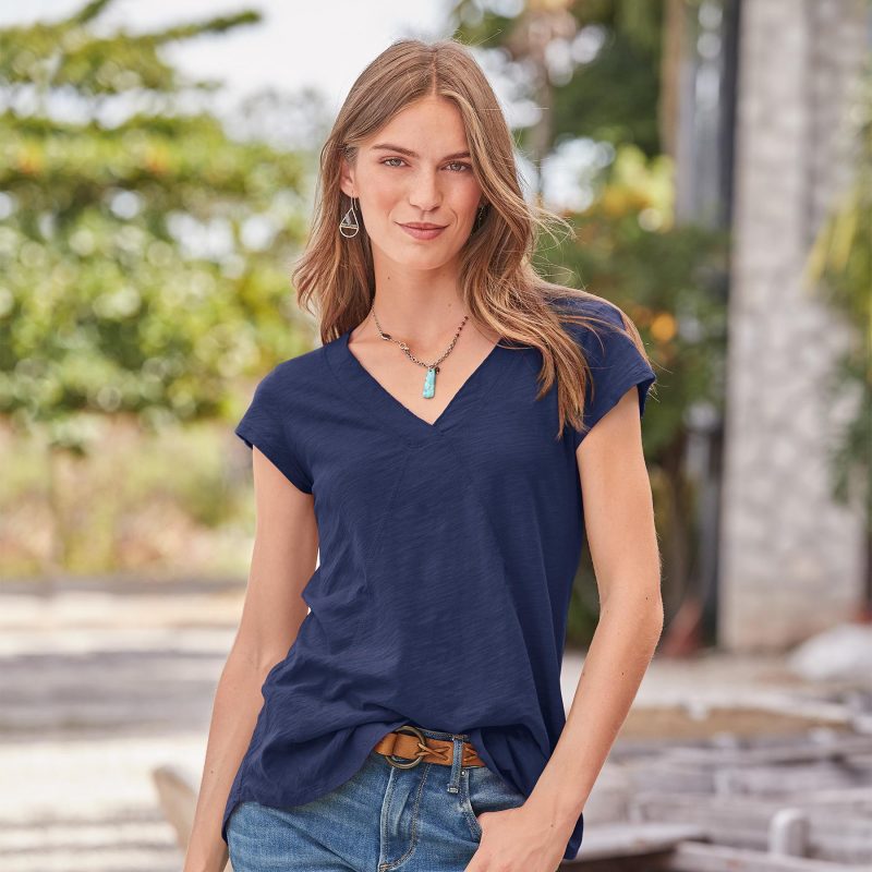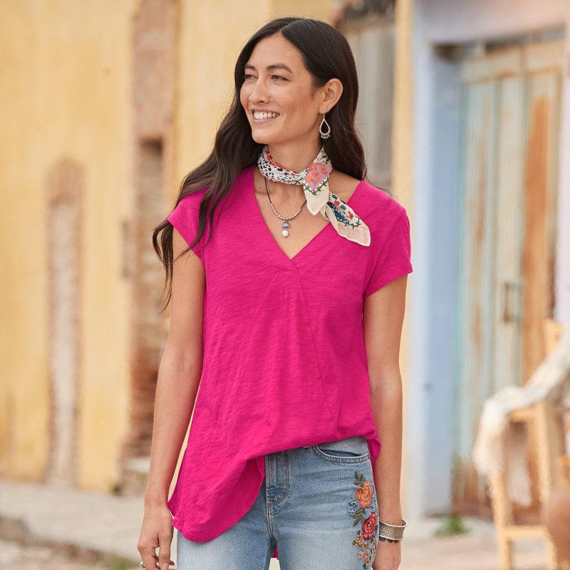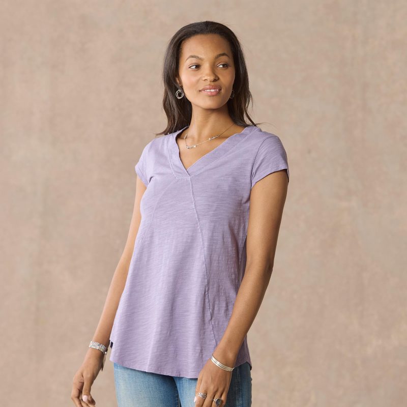 Comfy every day. this tee boasts subtle. directional seaming that flatters. V-neck and rounded. hi-lo hem. Cotton slub. Machine wash. Imported. Sizes XS (0-2). S (4–6). M (8–10). L (12–14). XL (16-18). XXL (20–22). Approx. 29.75l.