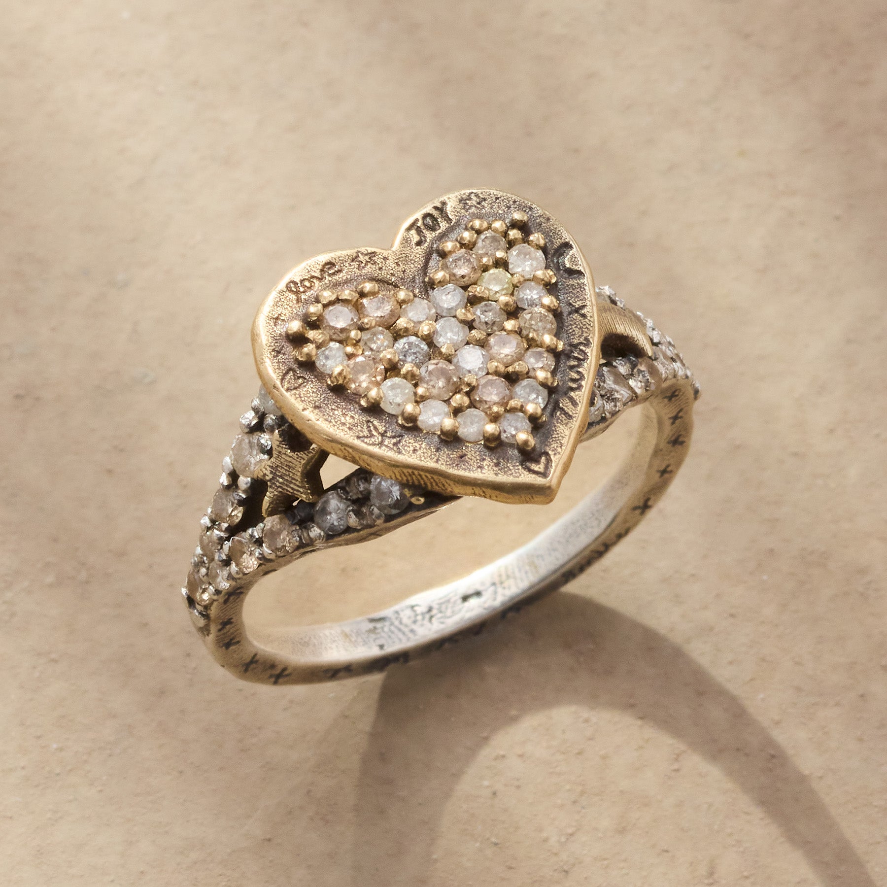 Boundless love expressed in sparkling diamonds. shining sterling silver and glimmering 14kt gold. Jes MaHarry’s enchanting ring surrounds a diamond-encrusted heart with celestial symbols and even more diamonds. Handmade in USA. Whole sizes 5?C9.