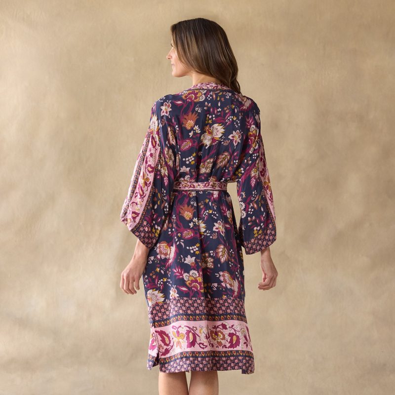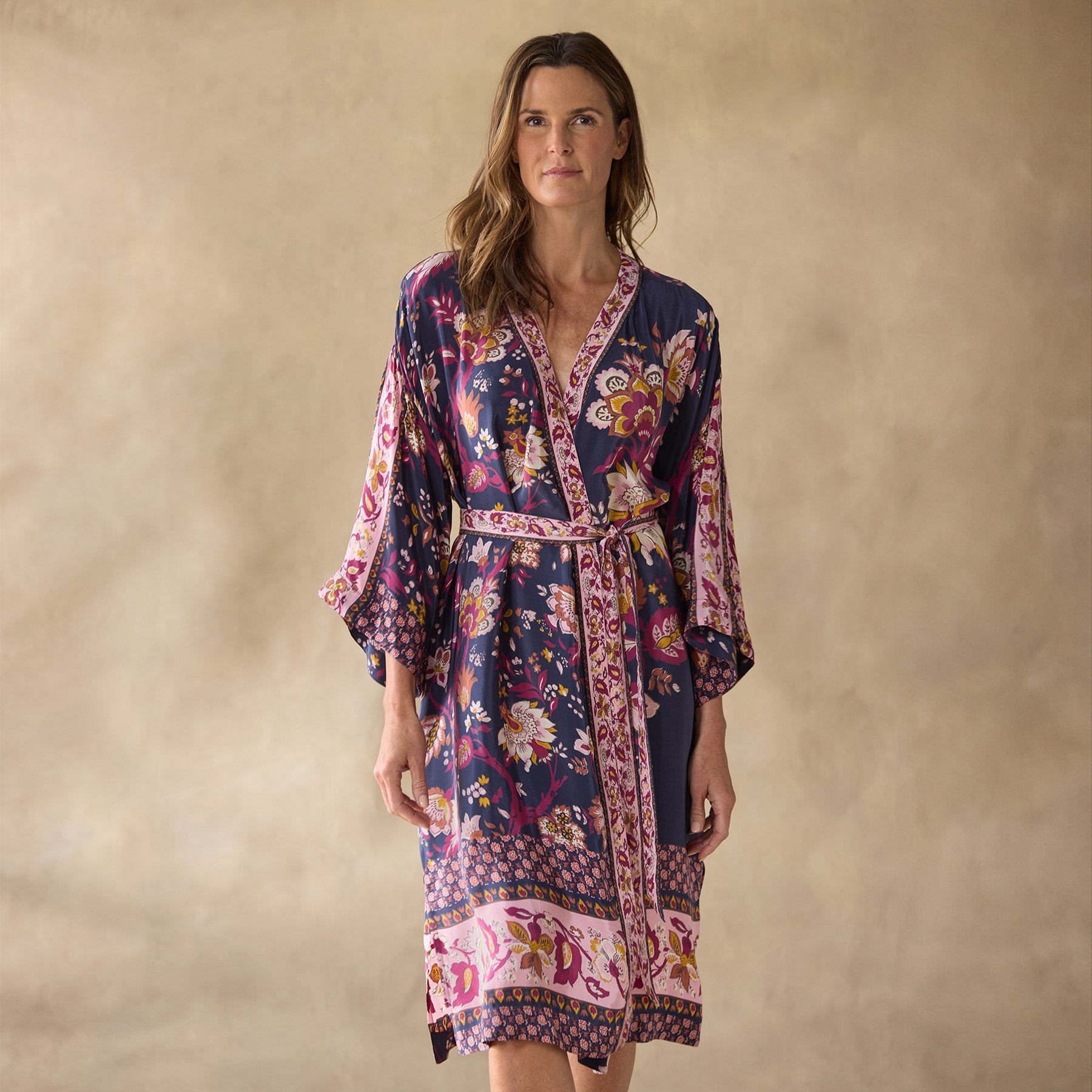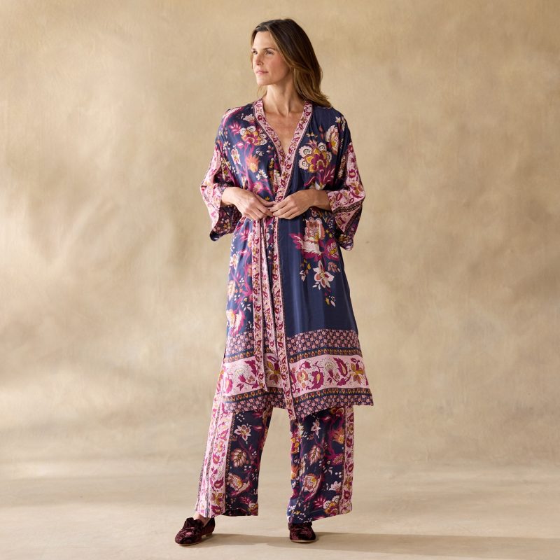 Flowing and feminine. our kimono-style. allover-engineered print robe has border prints. separate belt. side slits and pockets. Viscose. Machine wash. Imported. Exclusive. Sizes XS/S. M/L. XL/XXL. Approx. 44l.
