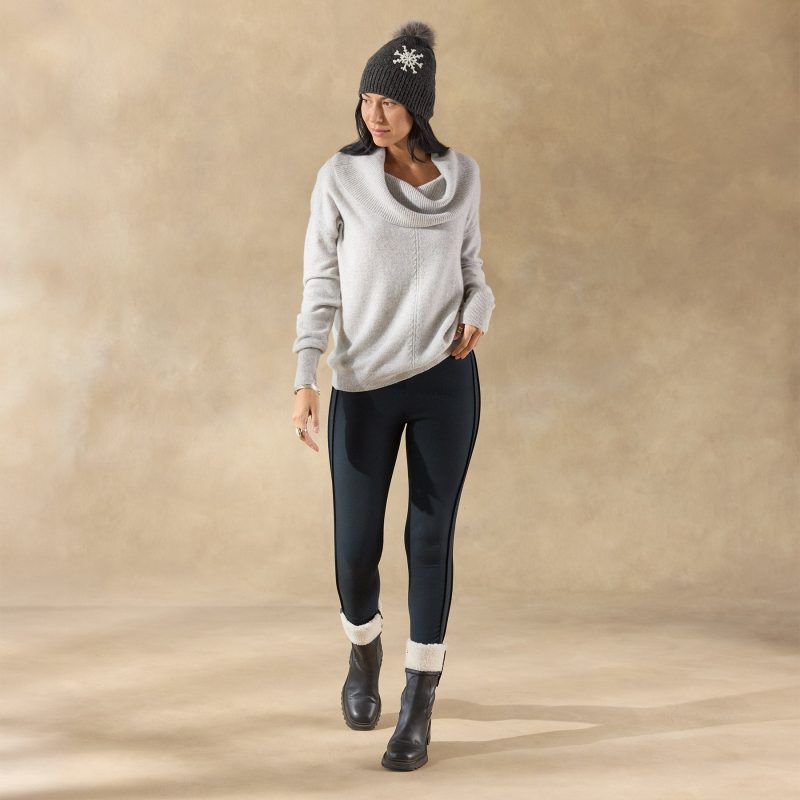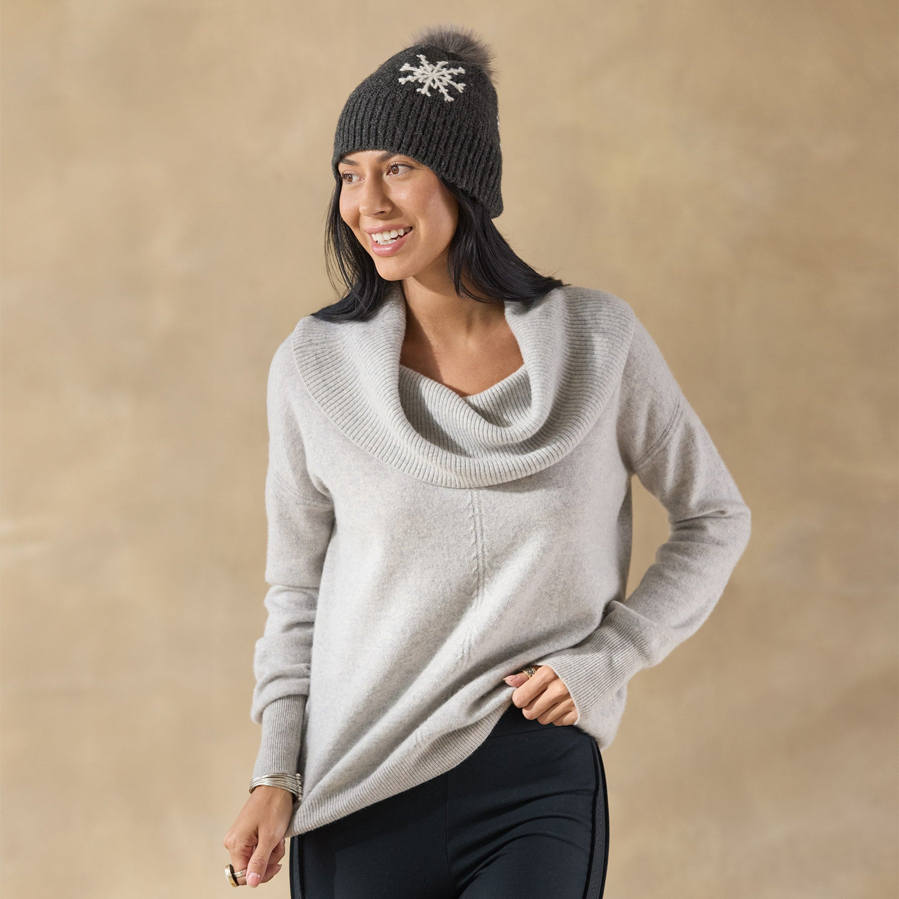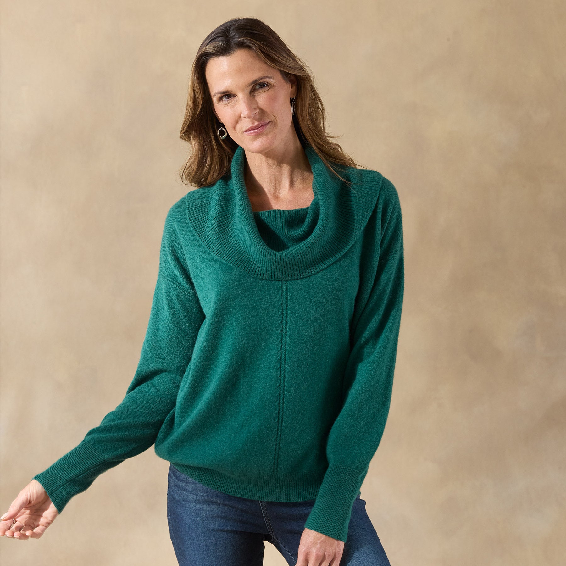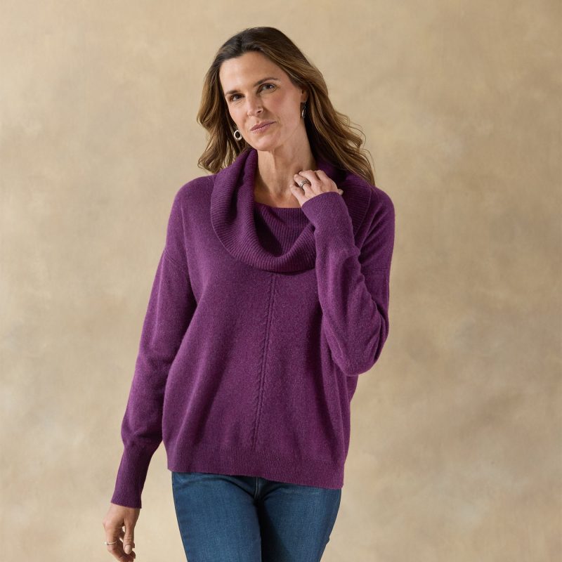 The coziest cowlneck sweater in lofty cashmere. with a ribbed cowl and sleeves. cable stitch detail at center front and back. and rib transfer details at armholes. Easy fit. Hand wash. Imported. Exclusive. Sizes XS (0?C2). S (4?C6). M (8?C10). L (12?C14). XL (16?C18). XXL (20?C22). Approx. 24l.