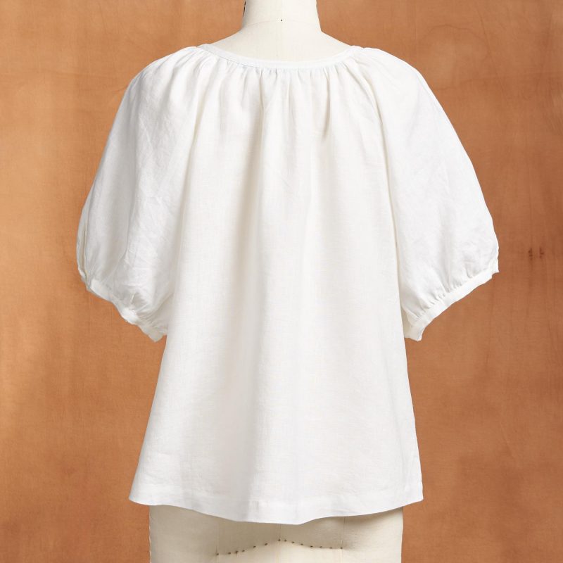 Our jewel-neck. dyed-to-match button front top is so airy and flowing. with elegant lace detail and blouson-style. elbow-length sleeves. Linen. Hand wash. Imported. Exclusive. Sizes XXS (00). XS (0-2). S (4-6). M (8-10). L (12-14). XL (16-18). Approx. 23l.
