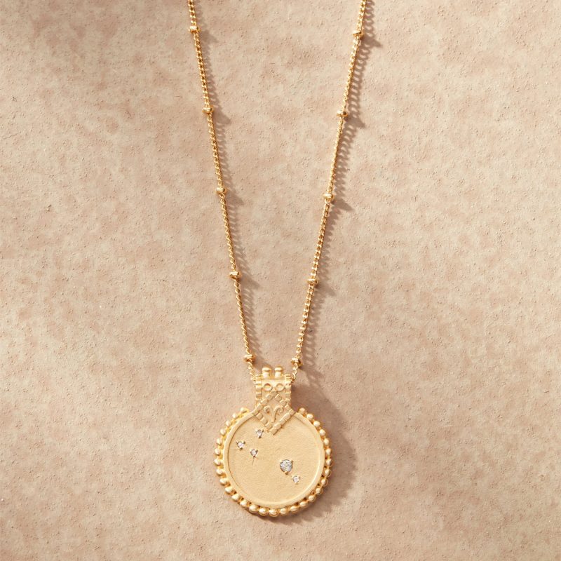 Constellations in sparkling white topaz remind us that we are governed by the stars. Handcrafted in 18kt gold plate. Spring ring clasp. Exclusive. Specify zodiac sign. 18l. 7/8 drop.