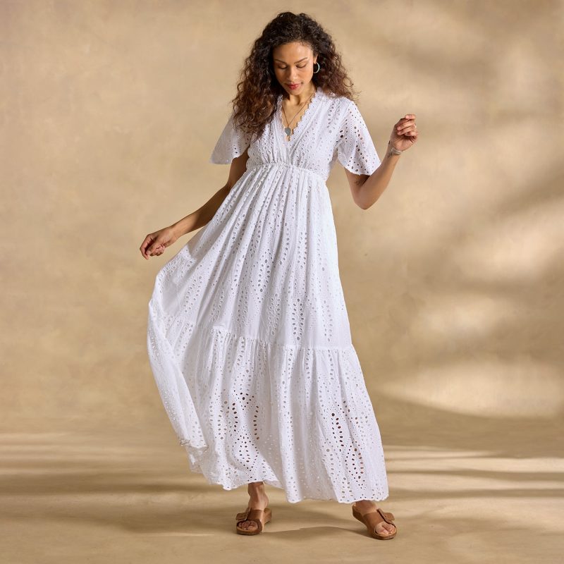 Nothing says weekend like crisp white from head to toe. Fresh and feminine. our essential Juno maxi features all-over eyelet with an easy elastic waistband. flirty flutter sleeves and pretty lace trim at the neckline. Cotton. Machine wash. Imported. Exclusive. Sizes XXS (00). XS (0?C2). S (4?C6). M (8?C10). L (12?C14). XL (16?C18). Approx. 49.75l.