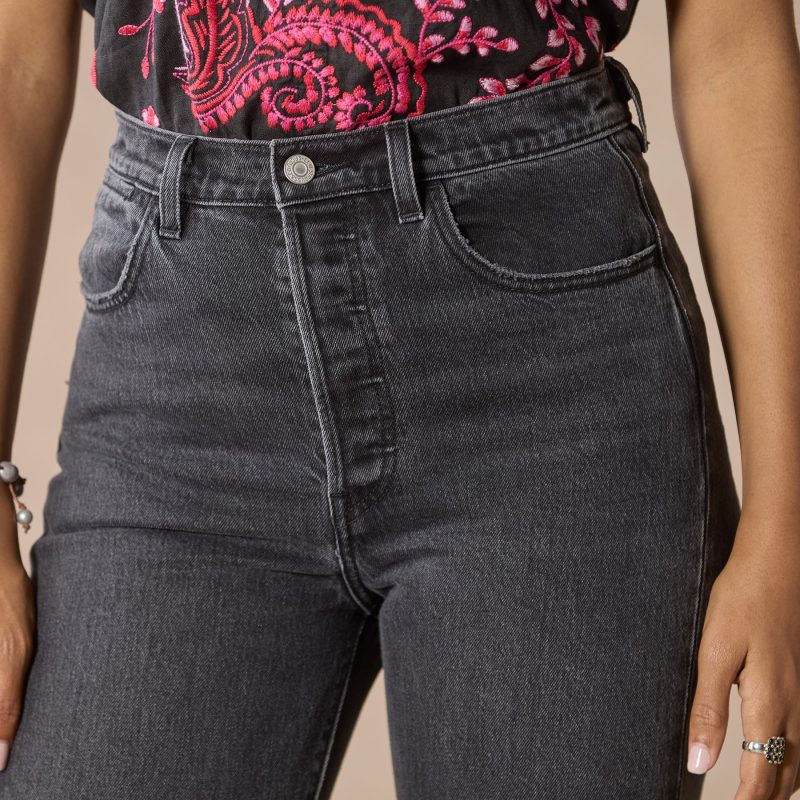 These jeans boast a flattering. hip-slimming. waist-defining. straight leg silhouette with a classic five-pocket design. Cotton/elastane. Machine wash. Imported. Sizes 24?C32. 27 inseam. 12 rise. 16 leg opening.