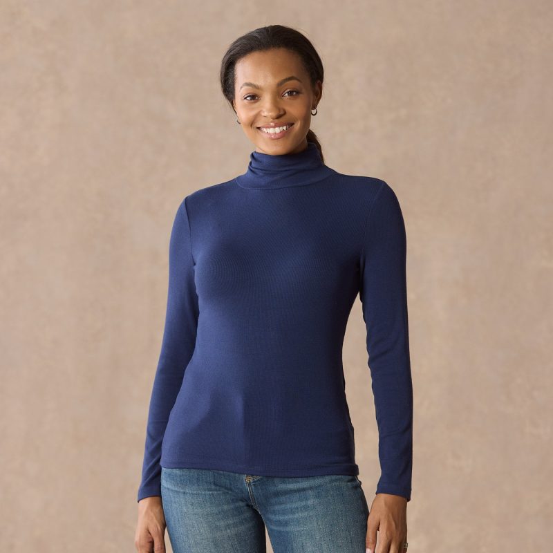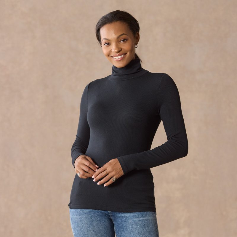 An essential in a classic fit. our soft as a cloud ribbed turtleneck is so stylish with roped turtleneck for a relaxed look. Contrast bar tacks at the side seams. Micromodal/spandex. Machine wash. Imported. Exclusive. Sizes XS (0?C2). S (4?C6). M (8?C10). L (12?C14). XL (16?C18). XXL (20?C22). Approx. 25l.