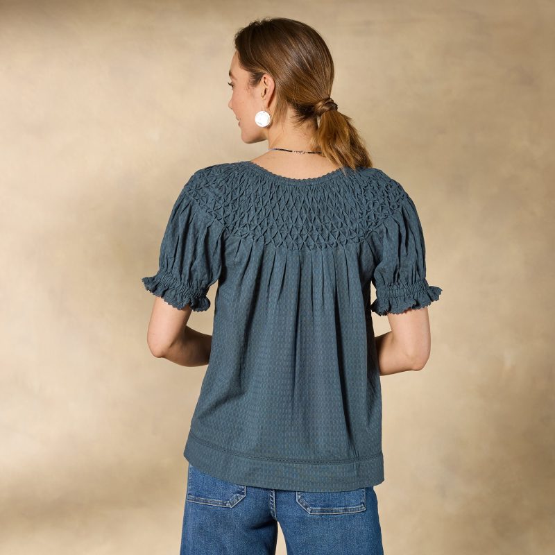 Feminine and textured. our Lodi Top is designed in bold colors with intricate details of lace and pineapple smocking. Button placket with loop closure. Elastic cuffs. Cotton. Machine wash. Imported. Exclusive. Sizes XS (0–2). S (4–6). M (8–10). L (12–14). XL (16–18). XXL (20–22). Approx. 24.5l.