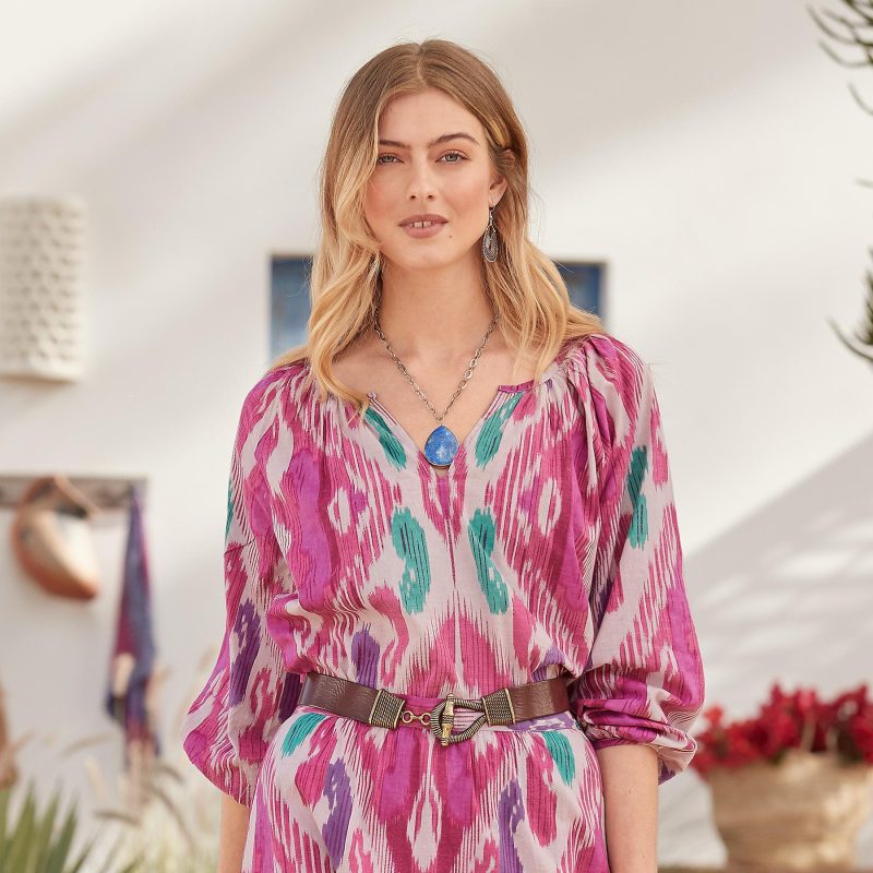 A vibrant ikat print makes a beautiful statement on this airy top with notch neckline. bracelet-length blouson sleeves and straight hem. Shirring at neckline and cuffs. Cotton. Machine wash. Imported. Sizes XS (4). S (6). M (8–10). L (12). XL (14). XXL (16). Approx. 25l.