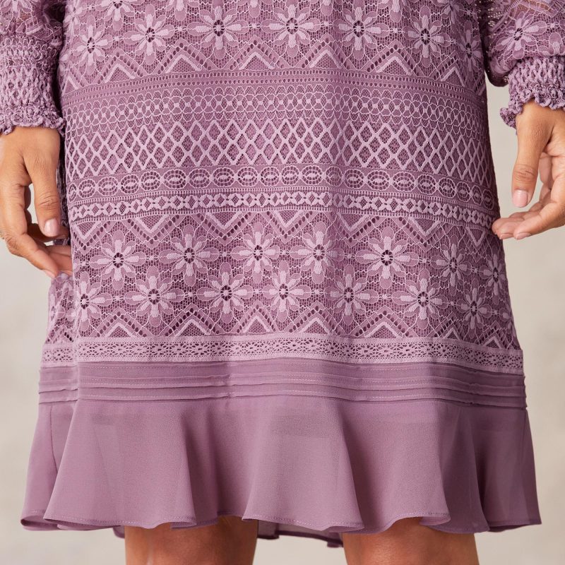 You’re a vision in our allover lace shift dress with chiffon pintuck detail. Flounce hem. tasseled neckline ties. smocked cuffs and full sleeves. Popover styling with separate slip. Nylon. Hand wash. Imported. Exclusive. Sizes XS (0-2). S (4-6). M (8-10). L (12-14). XL (16-18). XXL (20-22). Approx. 38.5l.
