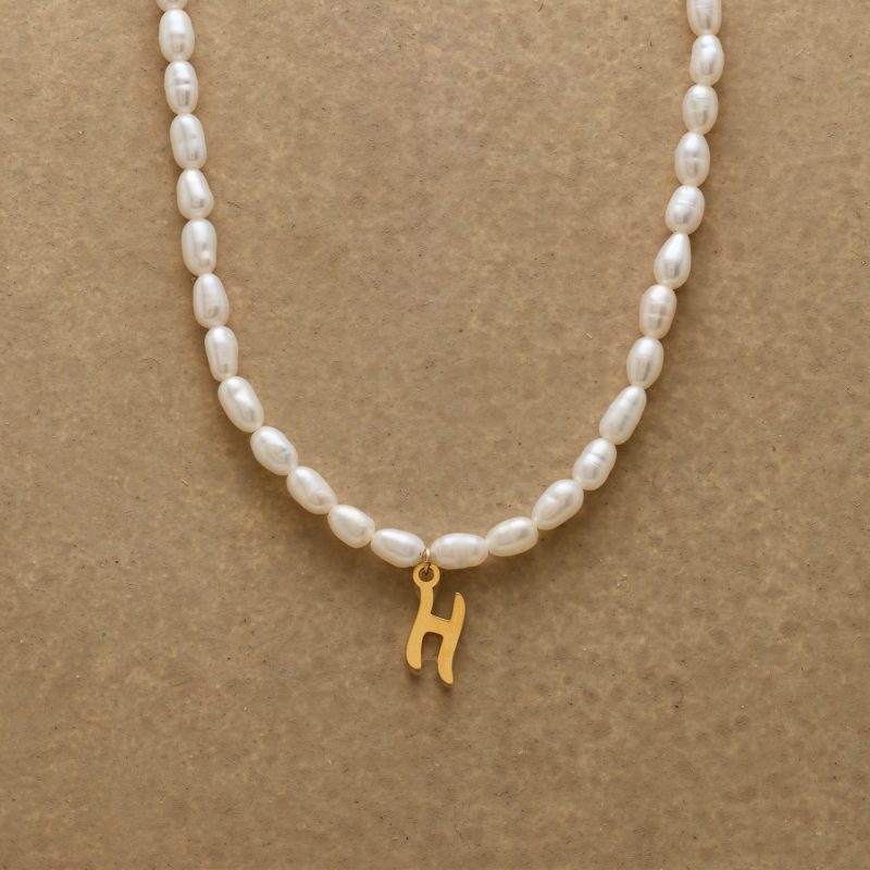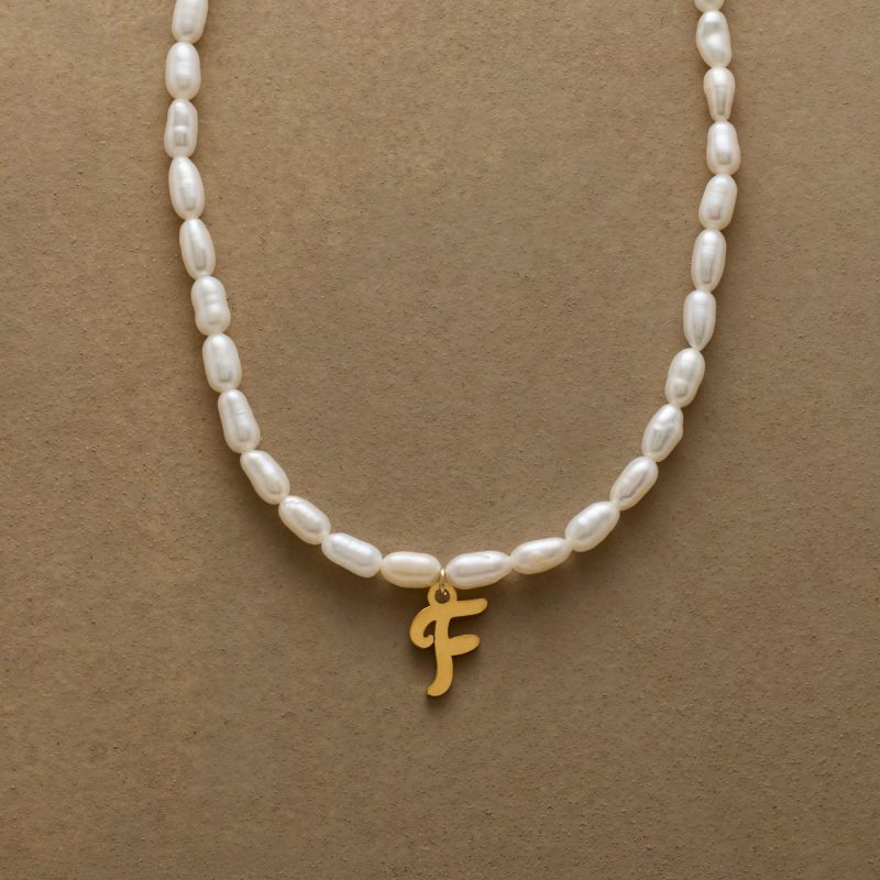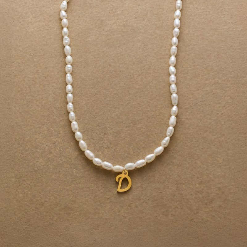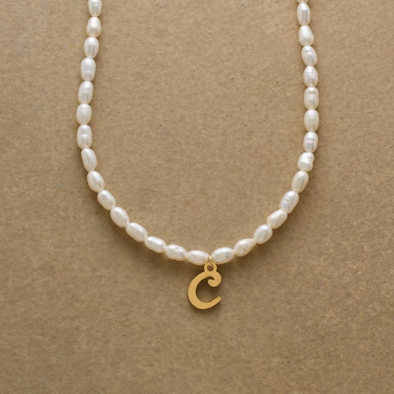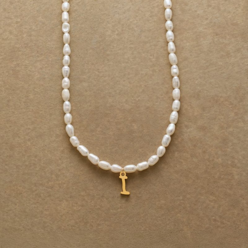 A letter-perfect example of everyday elegance. this string of freshwater pearls can be customized with a script alphabet charm. Charm and lobster clasp made of 14kt gold-plated stainless steel. Handcrafted with silk cord. USA. 15??6 1/2l.