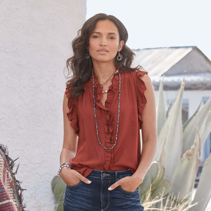 Flowing. easy-fit style with ruffles abounding. Hidden button placket. Rayon. Machine wash. Imported. Sizes XS (4). S (6). M (8–10). L (12). XL (14). XXL (16). Approx. 24-2/3l.