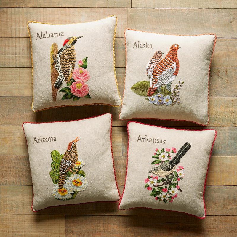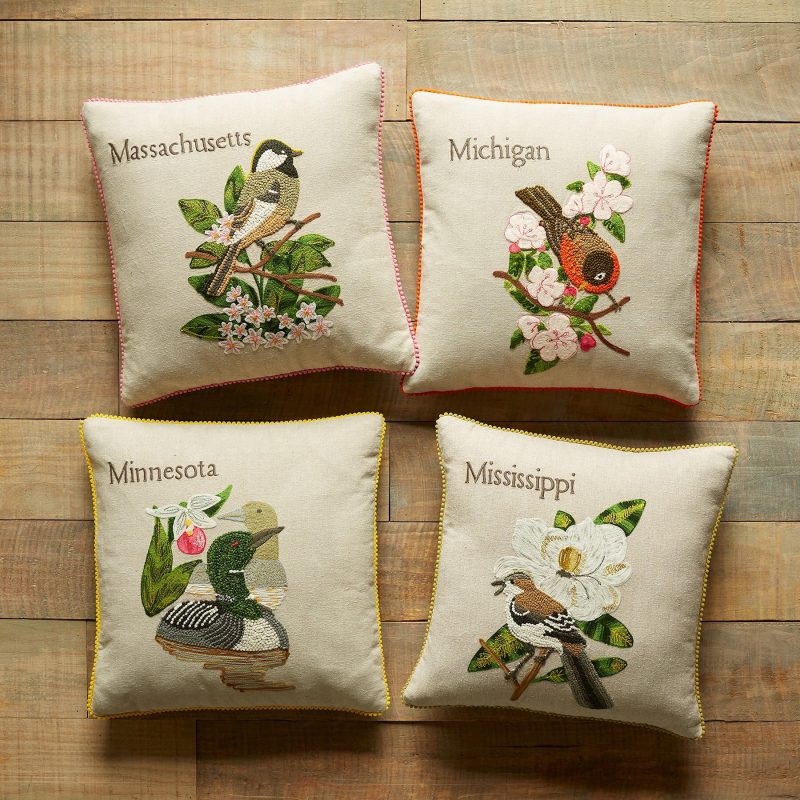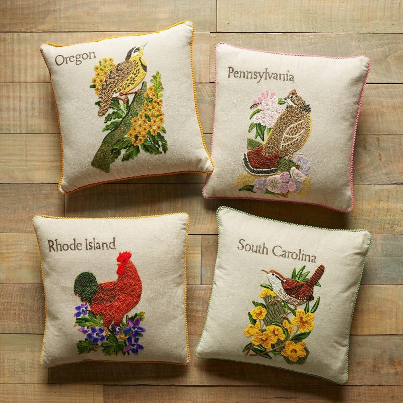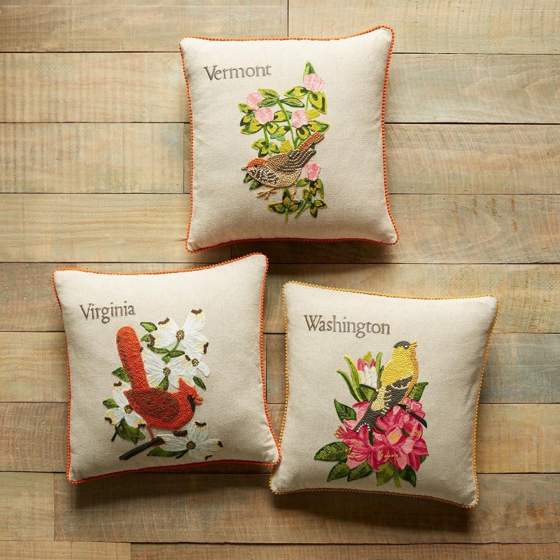 Celebrate the states you love to visit or the states you’ve called home with our exclusive decorative pillows hand knotted. textured and embroidered in vibrant. colorful detail. Each pillow features the iconic 1982 American stamp design with the bird and flower from each state proudly represented. Linen. Imported. 18 sq.