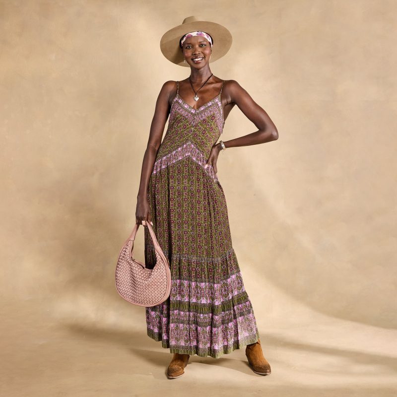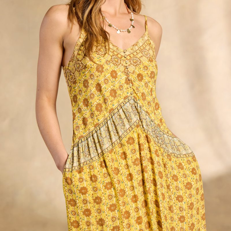 With a name that means supreme leader. our Naidu maxi is destined to become queen of your closet. A flattering V-neck graces the covered-button bodice. while all-over floral and border prints cast the perfect bohemian vibe. Adjustable straps. side seam pockets. side zipper and full lining. Viscose. Machine wash. Imported. Exclusive. Sizes XS (0-2). S (4-6). M (8-10). L (12-14). XL (16-18). XXL (20-22). Approx. 54l.