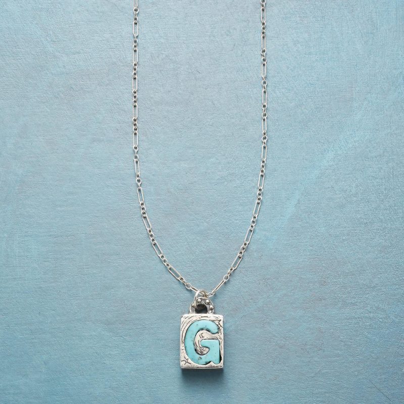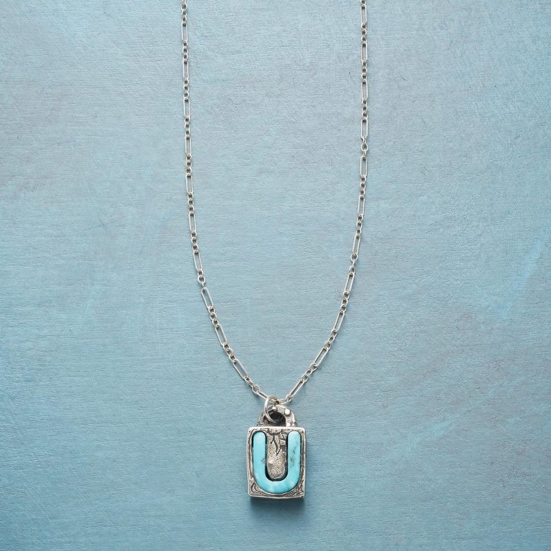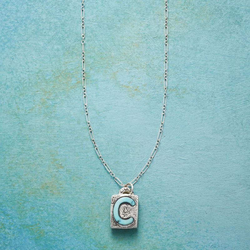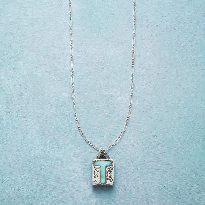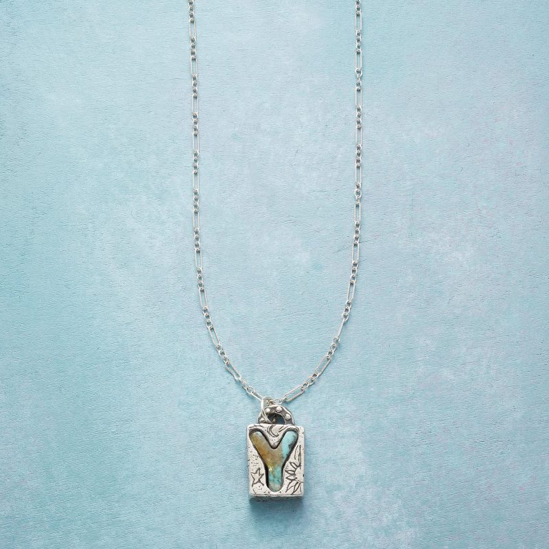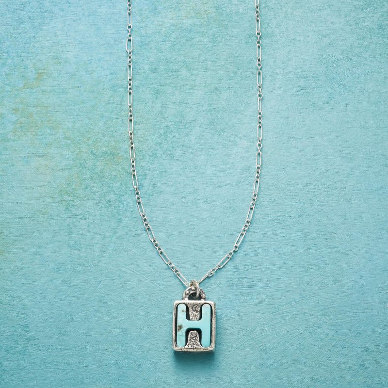 Jes MaHarry adds her personal touch. setting a hand-cut turquoise initial into a rustic bezel etched with joy on the side. love life on reverse. Sterling silver chain; Spring ring clasp. Exclusive. Handmade in the USA. Specify letter. 18l; pendant approx. 7/8l.