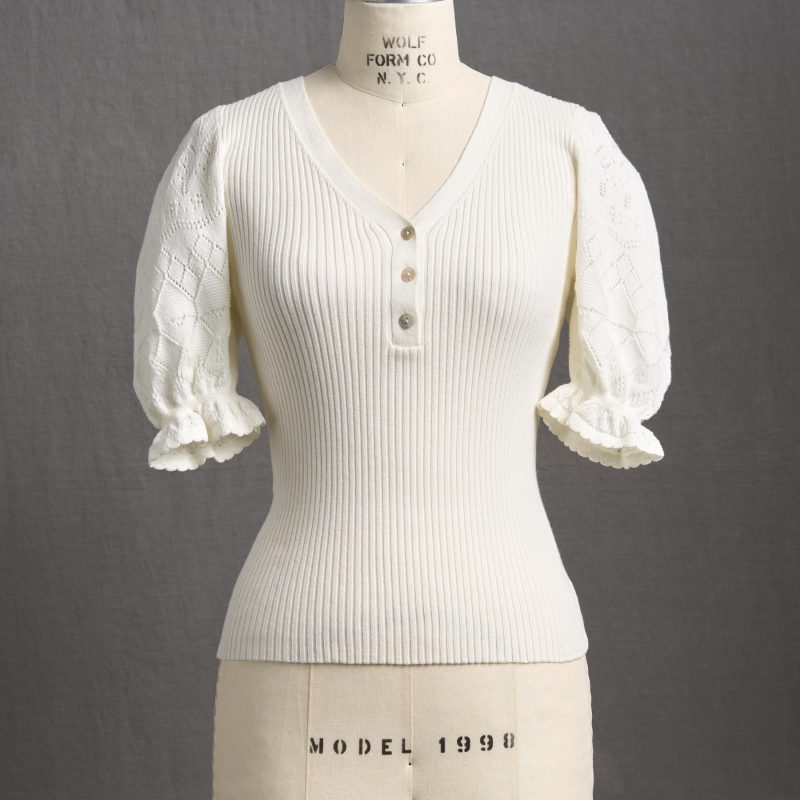 Experience the essence of luxury in our feminine and fitted V-neck henley. so soft in our Legends Lightweight Yarn. Beautiful pointelle at the bold puff sleeves and special scalloped trim details add an extra touch of grace. Organic cotton/nylon/spandex. Machine wash. Imported. Exclusive. Sizes XXS (00). XS (0–2). S (4–6). M (8–10). L (12–14). XL (16–18). Approx. 20.5l.