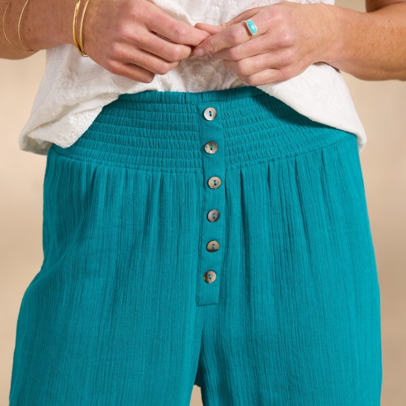 The easiest. breeziest warm weather pants. with wide-leg silhouette. smocked elastic waistline and decorative pearl buttons. Fully lined. Pull them on and go anywhere in style. Cotton. Machine wash. Imported. Exclusive. Sizes XS (0–2). S (4–6). M (8–10). L (12–14). XL (16–18). XXL (20–22). 29 inseam.